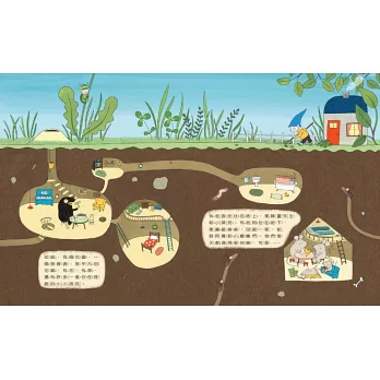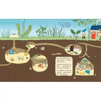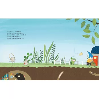 ▍以剖面圖的方式呈現地面上與地底下的情景,生動描繪出植物發芽、長根、開花、結果的生長經過,也可看出花園居民們溫馨舒適的地下房屋