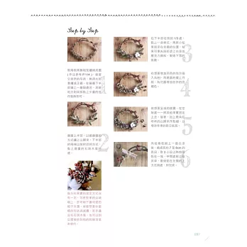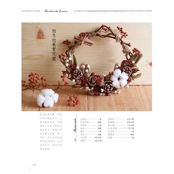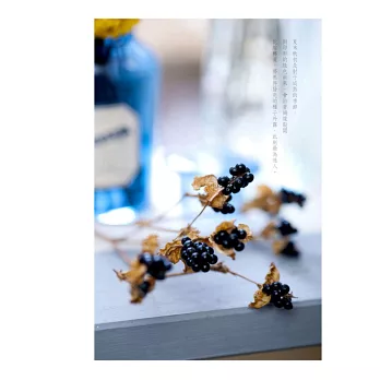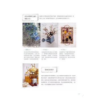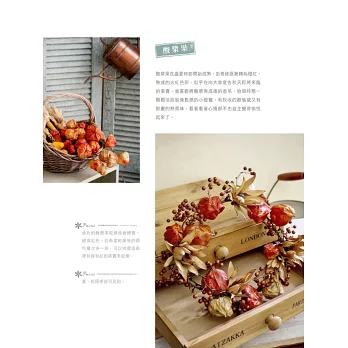繡球花是最常被拿來乾燥的素材,簡單一枝觀察它從新鮮到慢慢變色的過程,不但有趣,也可以長久放在家中擺設。製作乾燥花的手法並不難,但每種花材有其適合的作法,只要掌握原則,就可以盡享乾燥花藝的樂趣。Kristen在書中運用了多種花材與果實,並創作出獨具風格的花圈與花飾。