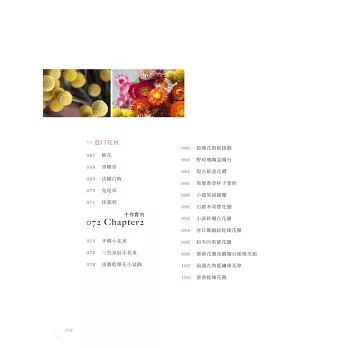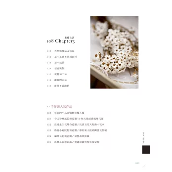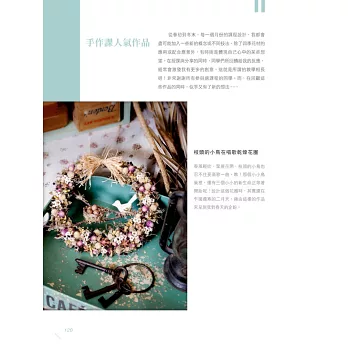 愛花的kristen,在自家開設了綠色穀倉工作室,除了販賣古董雜貨,也以乾燥花藝課程聞名。會開始玩乾燥花的契機是,鮮花雖然迷人,生命卻轉瞬即逝,在經過多方嘗試與實驗之下,kristen終於找到多種素材搭配創作,此書便集結了她的乾燥花藝心得。