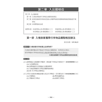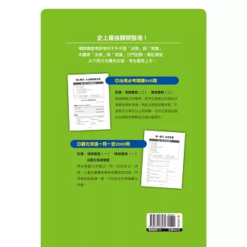 重點:經過題庫式的整理,原本生硬難以記憶的法條變得清晰易懂。再配合歷屆相關考題,不僅看完法條可以立即測驗,也可從歷屆試題出題頻率瞭解該法條的重要性。此外,還附上法條出處,讓您可以迅速找到法條對照、確認。