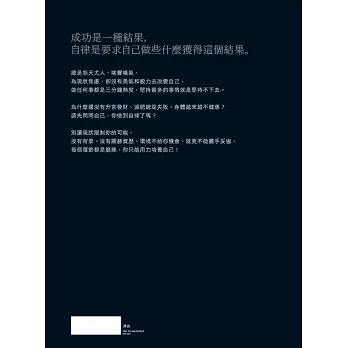 很多時候的所謂天才,不過是在別人看不見的地方仍然堅持自律。一旦習慣成為根深柢固的東西,就不需要投入太多的毅力,找到適合自己且能讓自己變好的方式,堅持下去,它會帶來巨大的改變。