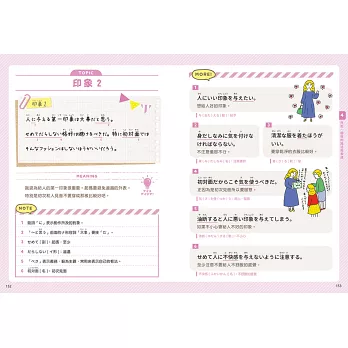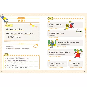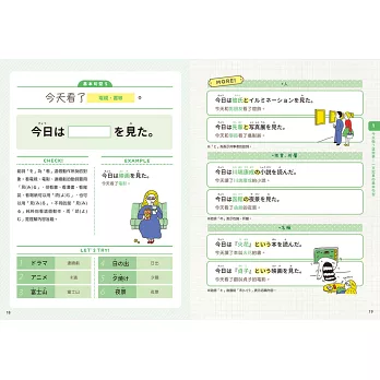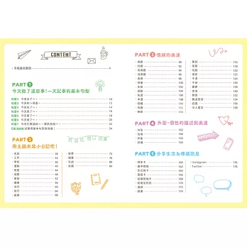 工作戀愛、美容健康、流行娛樂,針對各種主題的應用範例讓你可以在日常生活中輕鬆套用,學會不同情境中能使用的日文句子。每天的活動與心情點滴、給朋友的訊息、FB與IG上的貼文,都是你練習日文的好機會,時時刻刻都來點日文,讓日文充滿你的生活吧!