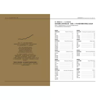 2020年我們即將選擇的,不只是總統和立委,更是對臺灣未來的想像,如果我們對過去與現況不夠了解,就容易造成偏見或誤解。因此,一群由22歲到32歲、從小生長在臺灣的年輕人組成資訊圖表設計團隊,翻遍公部門和國際組織報告,將100個重要議題自2000年以來的發展,彙整成一目瞭然的圖表及深入淺出的文字,幫助我們跳脫個人意識或經驗,看見更完整的全貌。