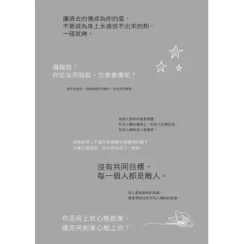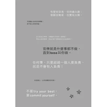 這本書是作者瑪格麗特 (黃麗燕) 身為一CEO,在外商公司多年的歷練後,淬鍊出的一本人生哲學書。起初還挺失望的,因為書名與內容簡介很有誤導性,這本書沒有介紹外商公司的環境,也不會提作者站在勞方與資方中間,到底得了什麼內傷。本書其實是作者給在職場上奮鬥的人士的建言,不管是基層人員或是主管人員,總共64道職場心態建議,從做人處事的態度、面對挑戰心態、待人接物的智慧等等,其實挺像許多坊間商管勵志書,各種通俗建議如建立自信、堅持不懈、形象塑造、團隊領導等等都很 common sense,不過作者也加入了強烈的個人風格,也有不少與通俗智慧唱反調的地方,從這些地方可以看出作者風格獨到之處。當然,許多商業智慧沒有絕對的對錯,作者部分的觀點個人也不是很認同,像是非黑即白的責任歸屬,或是不留退路的做法等等,但大部分的建議還算挺中肯的。個人挺佩服作者努力為台灣這塊土地打拼的精神,放棄去中國大陸發展的機會,努力為年輕人打造磨練的機會。雖然這本書不介紹外商,也不談內傷,但透過閱讀本書,除了可以學習、採納各種心態建議,也可以了解一個外商CEO之所以坐上那個位子,觀點有何其獨特之處。