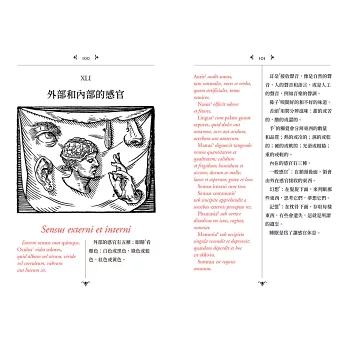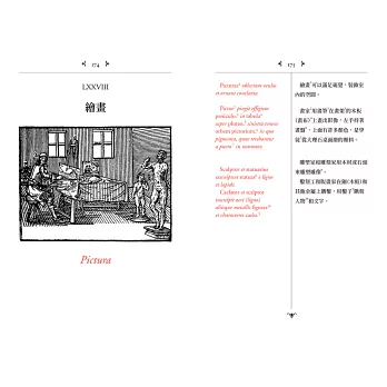 本書傳遞出這樣的概念:「如果事物可以透過不同的感官來感知,那麼就把你們的感官向所有事物開啟⋯⋯如此一來,感官就是最忠實的記憶提供者。」這是一部精彩的視覺百科全書,全書包含150章節,主題涵蓋「世界上所有基本事物及日常活動的圖像與名稱」。上帝、自然、物體、人類和文化活動,重新創建他那個時代關於道德和社會條件的不同面向。這本書最初是為了讓孩子學習拉丁文而設計的視覺百科圖鑑,當時透過圖畫進行教學,在語言學習上引入一種新穎而具有革命性的提議。