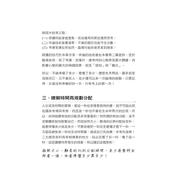最後要提醒同學,本書的各個章節都可以分開看,想先看哪裡就先看哪裡,不一定要從頭到尾的按順序研讀。但是最好全部都看過,把您覺得有幫助的學下來,因為在讀書方法上,我的方法不一定適合您。可是在寫申論題的部分,應該大部分的同學都需要學,因為寫申論題沒有方法適不適合自己的問題,而是能不能「適合閱卷官」!在這方面,若是您比我厲害的話,應該早就考上了,何需要看這本書!因此,第二篇務必好好學,否則就白看這本書了,不如不看!