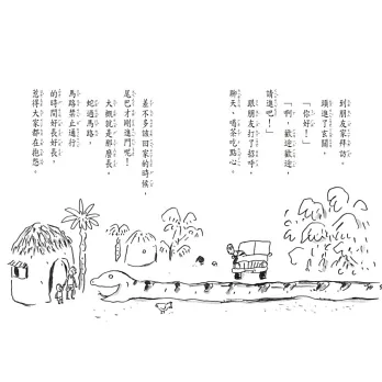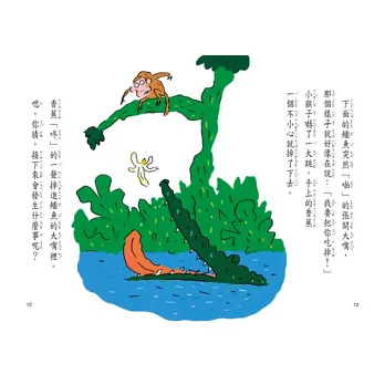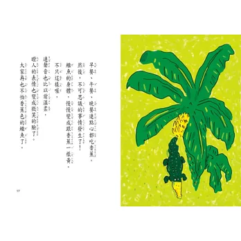 鱷魚看起來凶巴巴,大家都不敢接近他,看到他就逃,所以他只能靜靜的泡在水裡晒太陽。有一次,猴子在樹上準備吃香蕉,被鱷魚張開的大嘴嚇了一跳,手裡的香蕉正好掉進鱷魚的嘴裡。鱷魚從來沒吃過這麼好吃的東西,不由得笑了起來。從此,他每天在樹下等著吃又香又軟又甜的香蕉。日子一天天過去,不可思議的事發生了。鱷魚的顏色竟然變成像香蕉一樣的黃色,連臉上的表情也變了。現在他會與瞪羚打招呼,也會載猴子過河喔!沒騙你,不信你去問獅子!