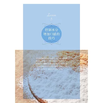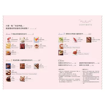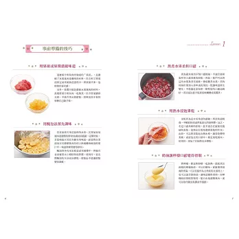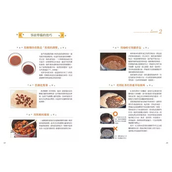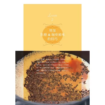 這些技巧說穿了其實並不難,但卻會大大影響成品的風味與口感。本書將會分成三大項目,針對增添水果風味的技巧、增添焦糖&咖啡風味的訣竅、增減食材水分以提升整體口感等面向,為大家提供各項實用的前置作業技巧,以及數道可以讓大家加以運用這些技巧的美味蛋糕食譜!