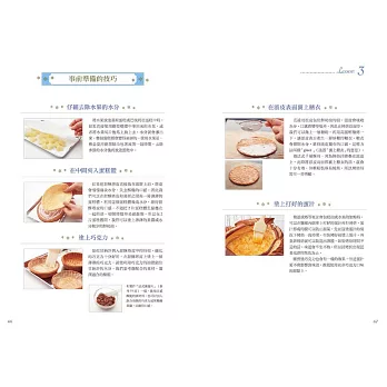 包有奶油餡的派或是水果塔,都是能享受到酥鬆口感的甜點,但是當鮮奶油或水果的水分過多時,就會讓口感變得濕軟,減損美味程度。第三章將為大家介紹幾項降低水分的技巧。只要事先花費一小番工夫,就能確保美味並提升成品的完成度。