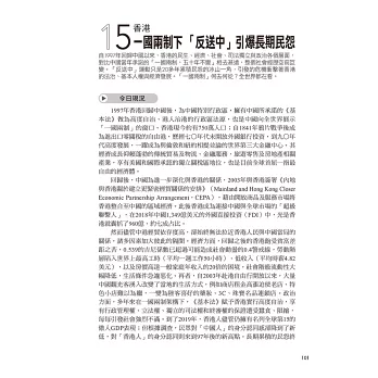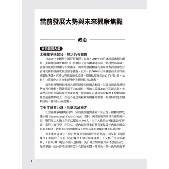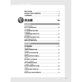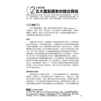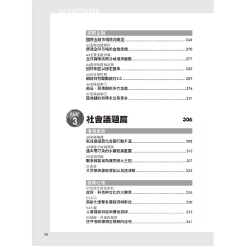 2020年最新版本從【政治】、【經濟】、【社會】三大面向勾勒當今世界輪廓,一方面提出梗概,另一方面建構細節,援引具公信力的資料與真實案例為佐證。全書67篇文章深入淺出,搭配提綱挈領的視覺化圖表,觀點與層次聚足。一本就能貫通當今國際間重大課題、事件、風波、潮流的來龍去脈,為讀者攤開一幅廣度深度兼備、與時俱進的世界版圖。