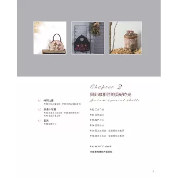 這本書與以往的著作有大大的不同,簡單的配色,加入一些些刺繡元素,能讓主題更加突顯,不需要太過華麗的設計,也不需製造花俏,美的因子就能隨之發酵,溫馨滿室。