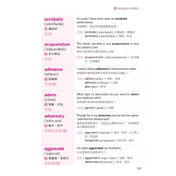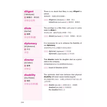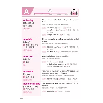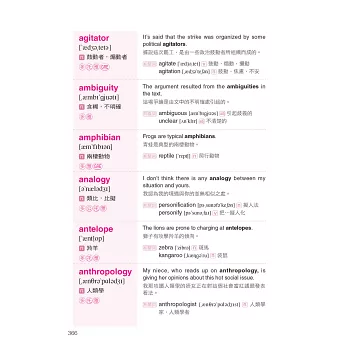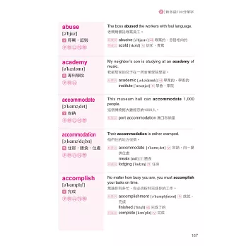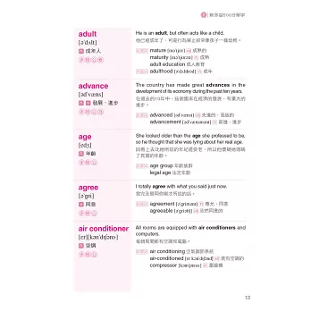 回到書中的具體細節,我們很快的看看它高效率的版型。我舉個例子說明,第一章48頁的economy這個字,主要單字旁有KK音標和中文翻譯。另外,還有一個極具知識性的例句:“If you want to be acquainted with the development of the economy in China, you can read some books about economics.” (如果你想對中國的經濟發展有所瞭解,你可以讀一些經濟學方面的書籍。)這個句子也有中文翻譯,旁邊還列出其他和主要單字有關的字,包括economics, economist和economic,以及這些字的中文翻譯。這是個必勝的模式,可以幫你新多益考試考得很好,除此之外,這本書對於其他考試來說也能提供很棒的基礎,像是托福、全民英檢、GRE。我預祝你在未來學習英文的旅途中,有了這本書就能獲得最好的成效。