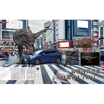 對於那些覺得「我等不了那麼久!」的人來說,有本好書要推薦給你,就是這本書。這本書中能看見有暴龍走在大馬路上、棘龍則往商店裡張望,簡直就像是恐龍們在我們的世界復活了一樣,這些給人錯覺的風景照片就收錄在本書當中。有各式各樣出現在日常生活當中的恐龍們,栩栩如生的躍於紙上。每翻開一頁都令人想著「恐龍也許真的還活著!」