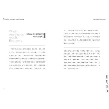 而美學經濟的重點在於象徵符號的價值認同與影響,當美學遇到經濟,會產生什麼樣的變化,書中從不同面向一一揭示,不論從哪個角度來看都是再日常不過;其實美學經濟的概念已經在生活中蔓延開了。好比我們去咖啡店,不只是品嚐一杯香醇咖啡,更希望在瀰漫咖啡香氣、樂音繚繞的愉快氛圍中,體驗生活的美好。我們透過商品的美學符號,進行一場場激情的對話。由此可知美學經濟是生活美學的徹底實踐,影響力的起點也是由小處著手。