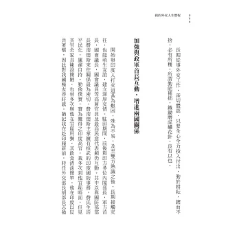 剛鐔兄以他三十七年從事外交工作的經驗,寫成此書。字裡行間,充分表現出他對外交工作的熱愛,對長官敬愛,對同事的親愛,讀起來十分溫暖、順當。而且篇篇簡潔,流利有加。莎士比亞說「簡潔(brevity)是文章的靈魂。」是以,本書不只是我國外交史上的一些記載,也是篇篇可讀性甚高的散文。尤其一些外交交涉的手法,更是外交工作者宜予研讀的範例。