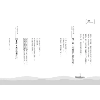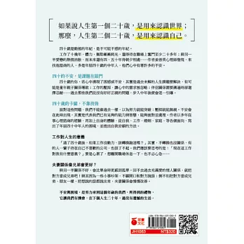 四十歲是孤單的年紀,外表或許光鮮亮麗,甚至小有成就,但只有我們自己知道,在開始花白的腦袋底下的靈魂,仍時常和年輕時一樣,有許多掙扎困惑,此時不妨看看本書,幫助自己整理內心,並迎接人生下半場。——今年四十歲的臨床心理師 方格正