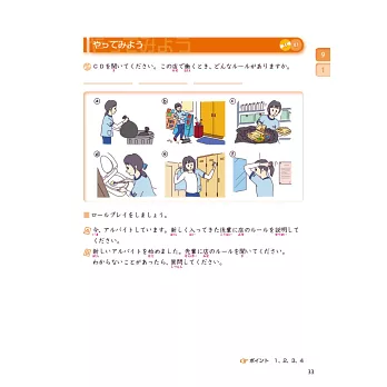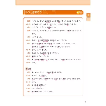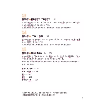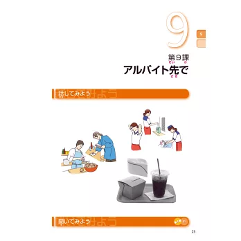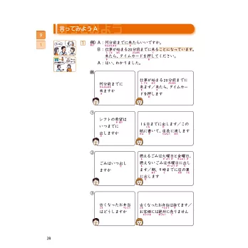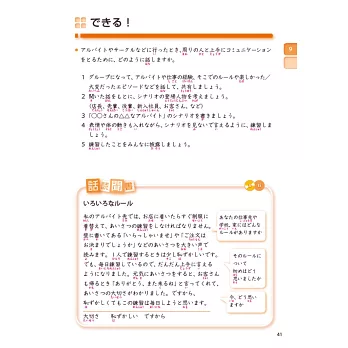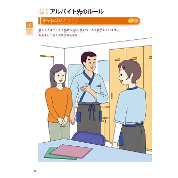 有別於直接進入文法句型或文章的教科書,是以「狀況插圖」提示會話進行的狀況,嘗試用已知的日語表達。讓學習者思考符合狀況當下的會話流程,提升日語的運用能力!