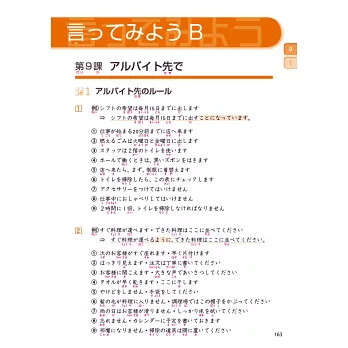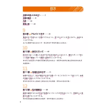 採用「購物」、「生活」、「旅行」、「拜訪」……等貼近生活的內容,並設立明確的課程目標。每課皆設定一個主題,再由3個相關小主題的「說說看」、「聽聽看」、「挑戰!」、「說說看A/B」、「做做看」依序深入練習。透過相似情境把握既有的語言知識,進而吸收新的文法與詞彙。