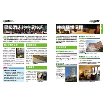 星級餐廳、酒樓、小吃攤、熱炒店、麵家;五星、四星、三星酒店、飯店、旅社;世界遺產、歷史建築、澳門新八景、澳門八景、中葡友好紀念物。吃的、住的、玩的、逛的一次網羅到位,所有店家、景點相關資訊完整收錄,讓你輕鬆規畫行程、安排時間。
