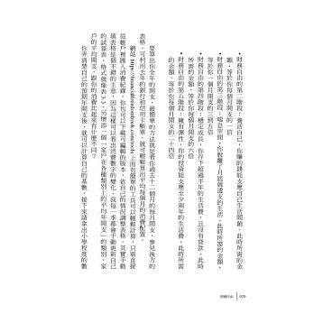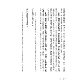 ★作者花了五年的時間達成財務自由,我自己也是花差不多的時間…本書其實說到很多財務自由的重點,是一本說到精髓的好書。在此也分享我自己財務自由的進程和心得:1.訂立存錢計畫,養成儲蓄習慣。2.找一份靠能力決定收入的工作。3.打造副業或投資,從小額開始。4.盡量學習關於財務自由的所有知識,包括資產負債、收入支出等。5.投資時間精進自己的副業和投資能力,累積志同道合的夥伴。6.將資金投資在你有把握、且能掌握的副業或投資上。林禮祥╱禮祥投資筆記