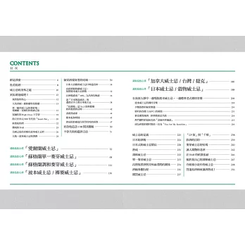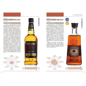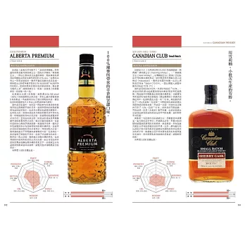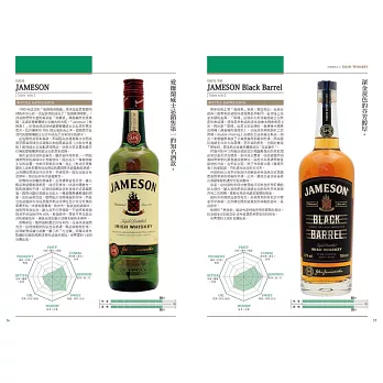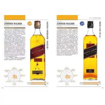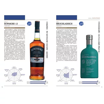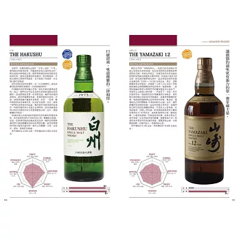 不但於書中逐一為每一款威士忌給出詳細的風味評比與參考售價,更將威士忌風味上的「CEREAL麥芽漿/麥芽/焦味/PUNGENT(嗆辣/灼熱/刺痛)/BITTER苦味/鹽味/土味/SWEET蜂蜜/香草/甘油……」以圖表式數值化呈現,給予最為實用性的客觀參考。