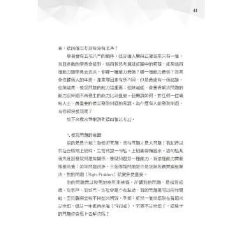 在此也提供給職場人士,看看自己得到幾分,請參考「附錄1:常見問題分析與決策症狀評量表」幫自己做測驗,有沒有都犯了問題分析與解決的一些常見症狀?如果真的有也不必擔心,只要循序漸進依照書中的步驟與方法,就可以慢慢的一一調整過來。