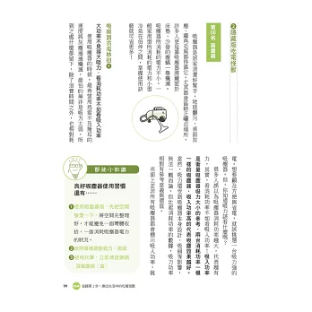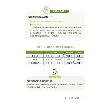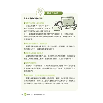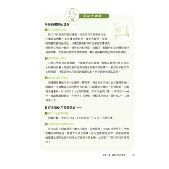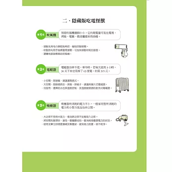 本書作者特別詳列台灣20大生活常用電器省電妙招,並將常用電器分成4大類:(1)耗電量驚人的超級吃電怪獸,例如冷氣、電燈;(2)耗電量大但不易察覺的隱藏版吃電怪獸,例如吹風機、電暖器;(3)因應氣候變化使用的特別版吃電怪獸,例如烘衣機、電熱水器,以及(4)只要善用,就能幫我們省更多的能省就省小幫手,例如電風扇、除濕機,並提供你立刻就能做到的省電技巧: