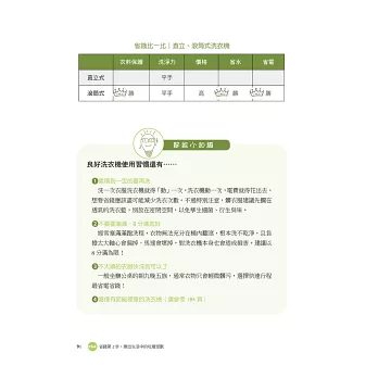 除了上述省錢妙招外,本書還提供「小資族省電省錢小撇步」,像是以電毯取代電暖器、單門冰箱關閉冷凍庫、洗衣次數少者,建議手洗+投幣式洗衣……等,以及經過節能專家實際測試的「各類家電機型大PK」,例如直立式VS.滾筒式洗衣機、石英管VS.陶瓷式VS.葉片式電暖器、電熱水器VS.瓦斯熱水器……等的耗電量與優缺點比較,讓你變身選購達人,並提供水、電、瓦斯DIY表格,幫你揪出錯誤的用電習慣,省到最高點,拯救你的荷包!