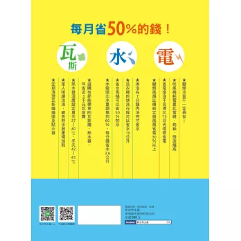 再者,台灣99%以上的能源仰賴國外進口,若我們再不節約能源,面臨的不僅僅是萬物皆漲、唯荷包不漲的窘境,更可能為我們帶來限水、限電以及環境的危機!換句話說,節約能源,把每一度電發揮到極致,才是最直接、有效的省錢方式,而且可以免除限水、限電的危機,達到省錢又救地球的雙贏目的!但是,想省錢就得過著不開冷(暖)氣、少開燈或夏天洗冷水澡的原始人生活嗎?當然不用!本書提供你「舒適便利」與「有效節能」的省錢妙招,讓你省錢+舒適+節能,每個月水電費激省40%,還能節約做環保哦!