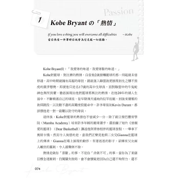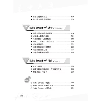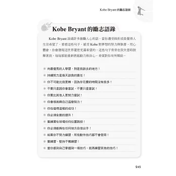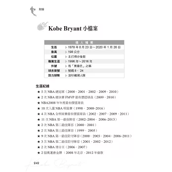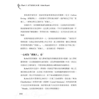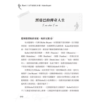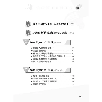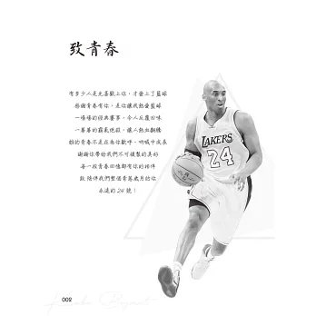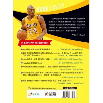 在我們紀念他、緬懷他、讚嘆他的傳奇、不捨他的離去的同時,本書希望發揚延續Kobe的精神,傳承他的「曼巴精神」,因為他的成功,都來自於這些人生態度、想法!其對籃球對夢想的熱情、對勝利的執著、對自我的嚴厲、對目標的堅持、對挑戰‧傷痛的無懼、永不言敗的意志……曾經感動和激勵許多人成長!