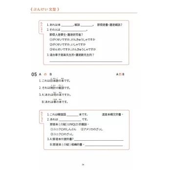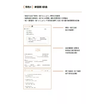 本書共收錄53個文法,文法量最多也最齊全,能夠完全掌握JLPT的必考內容。每個文法中導入大量練習,依據不同句型,以填空或造句的方式讓學生自行填寫。每課的結尾都附有「まとめ問題」,供學生立即檢視學習成果。每2~3課會再有一個「復習」,特別針對這幾課所收錄的文法,做最完整的綜合練習。練習題數量多且題型豐富多元!