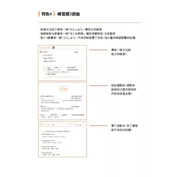 本書精選420個單字。配合時事與時代演進,收錄最新型的單字,例如「スマートフォン(スマホ)」等,以生活化、實用性為主,讓學生透過單字搭配句型,講出符合現代用語的日文句子。