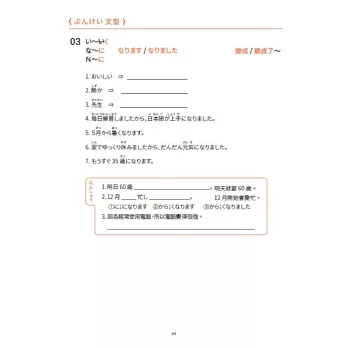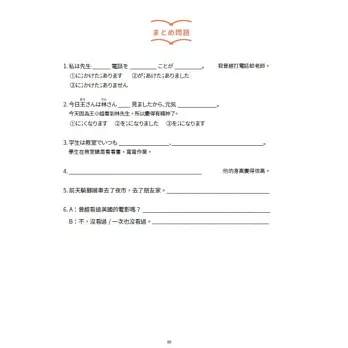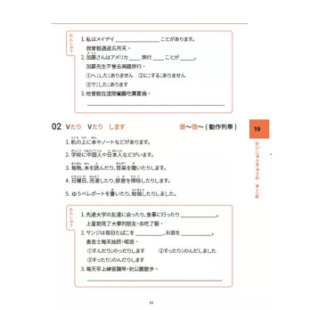 本書共收錄53個文法,文法量最多也最齊全,能夠完全掌握JLPT的必考內容。每個文法中導入大量練習,依據不同句型,以填空或造句的方式讓學生自行填寫。每課的結尾都附有「まとめ問題」,供學生立即檢視學習成果。每2~3課會再有一個「復習」,特別針對這幾課所收錄的文法,做最完整的綜合練習。練習題數量多且題型豐富多元!