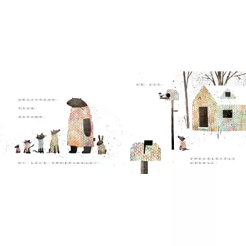 故事開始,場景的冷、黑白,與毛線可能帶來的溫暖和色彩恰是強烈對比。小女孩安娜一身的黑灰如同她的環境,但她在畫面上的位置彷彿從左頁的場景抽離出來在右方自成一格,暗示即將展開的變化。她首先改變自己和她的小狗。接下來一連串事件,看似偶然的生活際遇,其實是高明的作者運用「以情節說明角色」的文學技巧,有層次的形塑安娜的人格特質。她看穿了嘲笑背後的渴望,為嘲笑她的男孩織了毛衣;她讓每個同學都有屬於自己的毛衣;她無懼於不相信她的老師,也為他織了毛衣。畫面具體呈現,毛線使人和人之間有了連繫。與眾不同的山楂樹先生,使重複的情節有了變化。他異於常人的舉止,在不需要解釋的情況下被接納、被妥善照顧。全書唯一的特寫鏡頭,以一抹淺淺的微笑,見證安娜和毛線創造出的溫暖和色彩,包含了體貼的用心,以及對個別生命的尊重。織毛衣這項一再重複、看似簡單的行為,逐漸蘊涵了豐富的情感和力量,也使安娜後來面對挑戰時更有說服力。她的影響愈來愈廣,甚至改變了環境。情節發展中,圖像一直維持著幽默、簡潔的風格,以及文圖互補的想像空間。