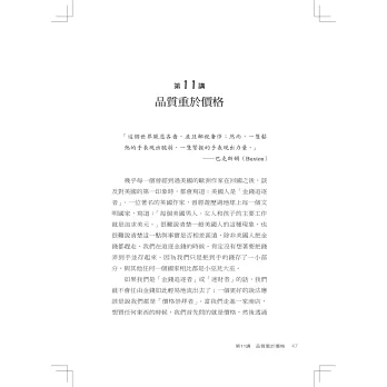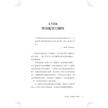 賺錢是工作,但明智地花錢卻是一門藝術。買便宜的東西並不一定就是明智的購買行為。與其花較少的錢買一件不能滿足需求,買下後也不會令你開心的替代品,還不如花較高的價格購買你所需要的那件東西。花較高的價格買一件正好合適的東西,也許能避免以較低的價格買三四件便宜貨,它們合起來也不如價格稍貴的那件經久耐用且滿足需要。根據品質買東西,忘記價格這回事。首先挑選你想要的商品,然後再詢問價格,你會驚奇地發現,以品質作為購物原則之後,竟然有這麼多次你會選擇其中比較不貴的商品。