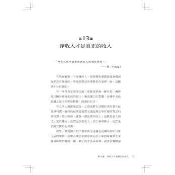 淨收入才是真正的收入。有太多人錯誤地認為,工資或薪水這種形式的收入就是淨利潤,最終的結果是他們永遠也無法享有任何真正的淨利潤。個人所得,就像一個企業的收入,也就是收入而已;至於傭金,它們也只是收入;而工資或薪水,它們是名副其實的毛利潤。首先,要從個人的工資和薪水這種毛利潤中刨除日常生活的開銷,就像企業必定會從其毛收入中扣除業務正常營運所需的費用一樣。剩下的才是淨利潤,或者是實際淨收入。對於大多數人來說,實際淨收入在毛收入中只占非常小的一部分。
