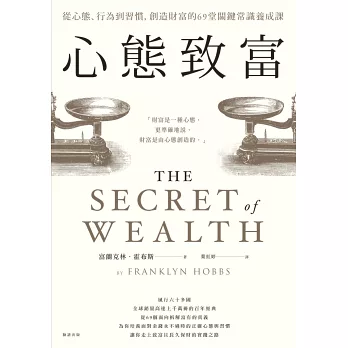 富蘭克林.霍布斯所撰寫的這本書,正是要告訴我們那些或許令人覺得老生常談,但我們其實從未認真思考過的心態與觀點。他匯集了從古至今關於創造累積財富的哲學、經驗和實踐,藉由淺顯的語言、真實的故事,以及關於財富的經典箴言,整理成69篇精簡扼要的文章,從消費、投資、工作、儲蓄、購屋等實際層面,到解析奢侈、節儉、自由、浪費、幸福等抽象觀念,娓娓道來關於財富的常識與真義。本書出版後,成為了史上最暢銷的財富經典之一,被翻譯成六十多國版本,全球銷量高達上千萬冊,直到百年後的今天仍為人津津樂道。