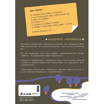 四十年前的偵探故事,現在讀來竟然依舊令人驚訝!角色、布局、謎題、架構……一直到最後,都捨不得放手……佩服作者巧妙的構思和鋪排,會對人物細節而折服,還會對隱藏在背後的溫暖、關懷、善意和體貼而感動。──林怡辰(教育部閱讀推手)