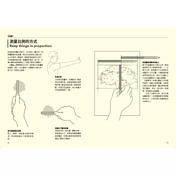 ‧測量比例──垂直握住鉛筆、伸直手臂、水平握住鉛筆、將測量結果轉移到紙上