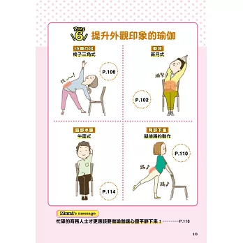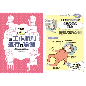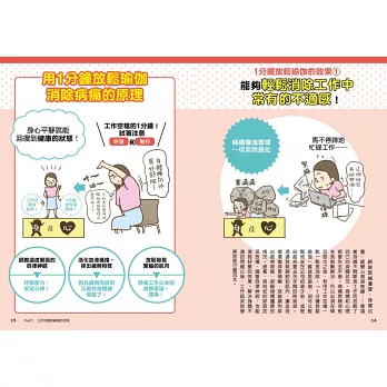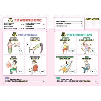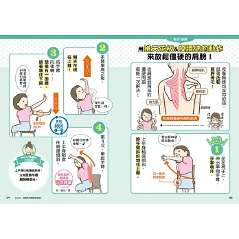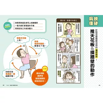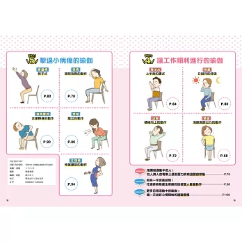書中右上角會用大字標出病痛的內容,讓讀者在快速翻閱瀏覽時能更快地找到想看的頁次。此外,也可以翻閱目次的動作一覽。