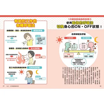 動作及呼吸的效果&詳細的做法,都透過漫畫以淺顯易懂的方式解說。使用較大的文字更容易閱讀,動作重點、身體伸展的部分、使用的肌肉等有效部位也清楚明瞭。