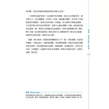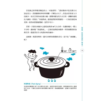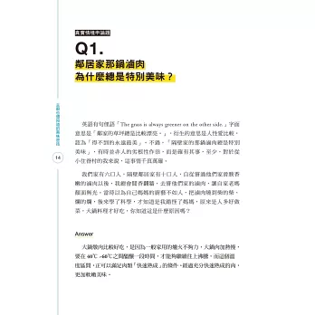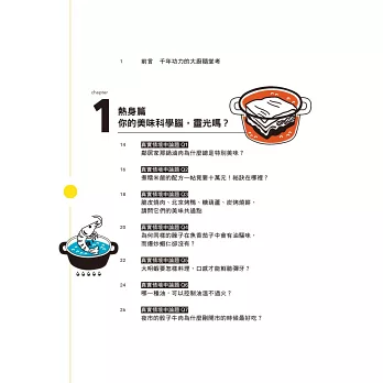 此外,作者將食材分類,深入淺出說明肉類、海鮮、青蔬與米麵,是如何以科學創造美味,並不藏私地告訴讀者調味方式帶來的魔法。除了科學原理外,作者還搭配「練習」,設計了適合的食譜,讀者看完就能做做看,還能利用同一種食材,不同的方法,做出不一樣的料理呢!看完此書,不但了解科學,相信廚藝更會大增。