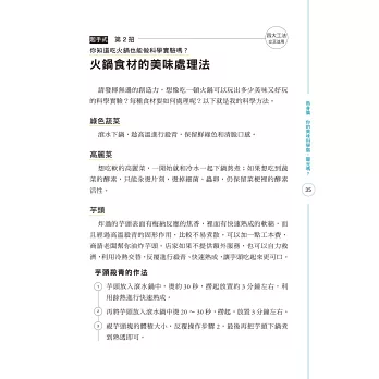 很多人看著食譜操作,但就是燒不出來好味道,原因是一般食譜並未透露細節與訣竅,照本宣科只有形似;很多煮了許多年飯菜的主婦,總覺得自己的料理普通,其實是因為不知道料理的科學原理,沒想到簡單的嗆鍋、以鹽水解凍肉類等方法,就能讓你成為被稱讚的大廚。