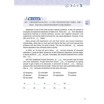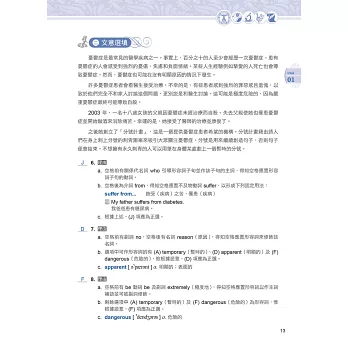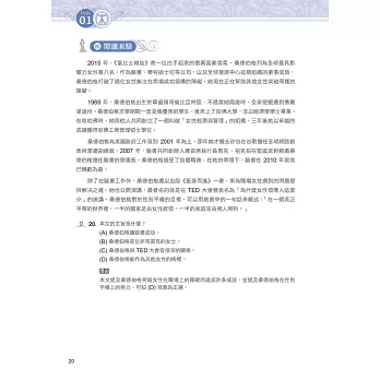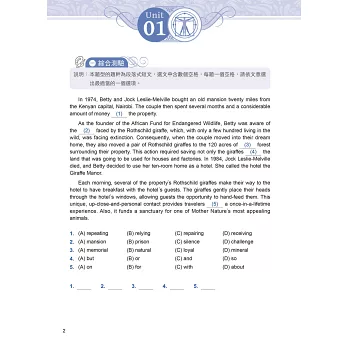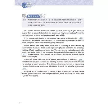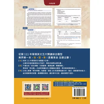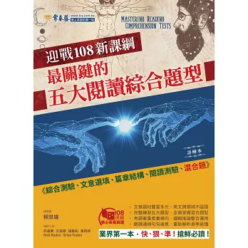 為此,本社特別推出《迎戰108新課綱:最關鍵的五大閱讀綜合題型》。本書共 20 回,每回皆包含「綜合測驗」、「文意選填」、「篇章結構」、「閱讀測驗」,以及未來將新增的「混合題」等五大關鍵題型。除此之外,文章選材豐富多元,涉及的領域跨越各個學科。命題方向則參考教育部所公布的準則,好讓考生能充分練習,並熟習將來多元化的新題型。而在版面設計方面,特別採用文藝復興時期,具代表性的圖像,以反映各領域文化素養的啟發與各項突破。各位若能熟讀本書並反覆練習,相信未來參加學科能力測驗英文考科時,必能勇奪高分!
