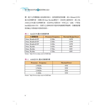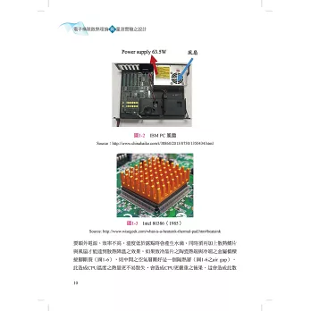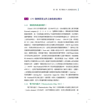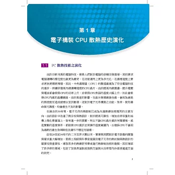 本書針對一般業界或專業領域人士所欲了解的部分提供詳盡介紹,至於一般熱交換器製造、鰭片設計等,由於坊間已有許多專業書籍,本書將不再贅文說明。本書第1章簡單介紹電子構裝散熱,特別是CPU散熱歷史的演變。第2章在必須應用到的熱傳重要基本觀念上做基礎的介紹,以便讓非工程領域的人亦能理解,了解熱之性質與物理行為後才能知道如何散熱,以及散熱之方法、工具、量測及理論公式。第3章旨在敘述流力的基本觀念,重要的是如何計算壓力阻力,從壓力阻力才能算出空氣流量。第4章探討一般封裝IC後之接端溫度TJ之理論解法。第5章討論一些實例的工程解法,包括自然對流、強制對流下溫升之計算,簡介風扇及風扇定律、風扇性能曲線、鰭片之阻抗曲線,以及如何利用簡單的區域分割理論求取鰭片之阻力曲線。第6章至第9章則注重實務經驗,尤其是實驗設計,其中包括理論設計及實驗之技巧。第6章說明如何設計一個測量熱阻的測試裝置(Dummy heater)。第7章解說AMCA規範下之風洞設計如何測量風扇性能曲線及Cooler系統(或鰭片)之阻抗曲線。第8章以熱管之理論與實務為主,逐一介紹其中重要之參數及標準性能,並說明量測之原理。第9章對LED散熱重要之癥結做了觀念上的說明,注重於LED之內部積熱如何解決。二版新增的第10章則詳細敘述如何利用Angstrom方法量測熱管、均溫板、石墨片、石墨稀等物質之熱傳導係數K值。