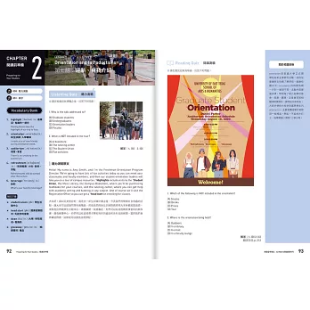 有時候難以理解的不只是對話,各類圖表和密密麻麻的英文也讓人心生畏懼,或是教授連珠炮似的課程大綱說明。別擔心,我們都想到了,書中有實境照片圖解並加以解說,如「醫療保險方案」、「學校餐點方案」、「課程大綱」、「租屋廣告」等,許多圖表還搭配測驗題,考考你是否真能看懂。