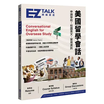 針對海外校園生活所想得到的各種需求,收錄最派得上用場的對話,獨家「Common Phrases好用句」讓你遇到狀況隨學隨用!如「詢問註冊問題,你要會說」、「在課堂發言,你要會說」、「詢問學生證可享優惠,你要會說」、「和室友溝通,你要會說」。