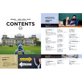 各主題先介紹相關的實用資訊,像是「申請美國學生簽證」這篇就先告訴讀者申請流程、學生簽證種類、簽證面談程序與答題技巧。先對申請簽證這件事有個大方向的認知,接下去看相關好用句和面試對話才夠清楚。讀完整本,包你就像美國學生一般如魚得水!