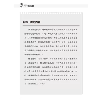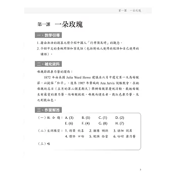 ☉本手冊分為教學引導、補充資料、學生作業簿解答與聽力內容附錄四部分:教學引導說明每課教學重點與教學方法;補充資料則舉出與每課劇情有關的學習常識或教學補充資料;每課皆附有學生作業簿解答,供老師參考;聽力內容附錄錄製於課本所附之MP3音檔,教師得要求學生於每課開始前及結束後各聽一次,一方面加強聽力,同時也有自我測驗的意味,比較在尚未學習生詞、句型前可聽懂的比例和學完生詞、句型後可聽懂的比例,有助於了解學習成果。