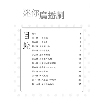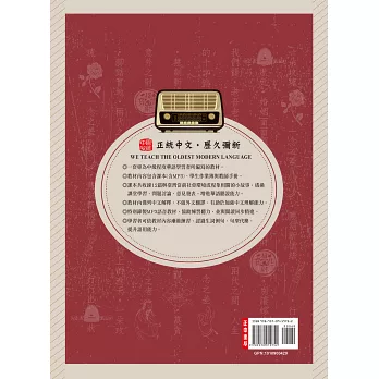 由國內華語教學權威──國立臺灣師範大學國語教學中心策劃主編,專為中級程度華語學習者編寫,全套教材包含課本(附MP3音檔)、教師手冊、學生作業簿共3本,以廣播劇的方式,平實的對話內容,提升聽說能力,達到流利說華語的目的。